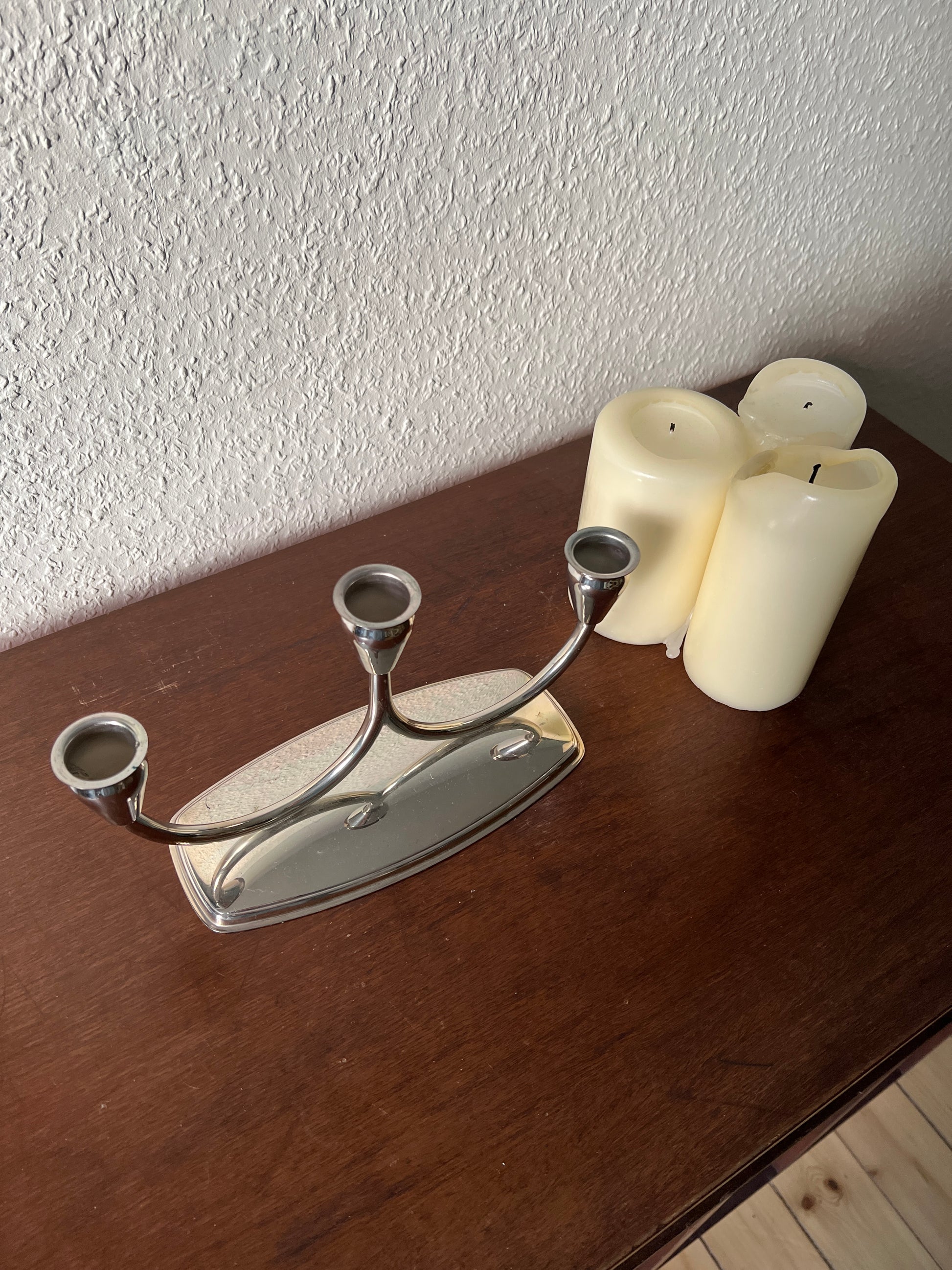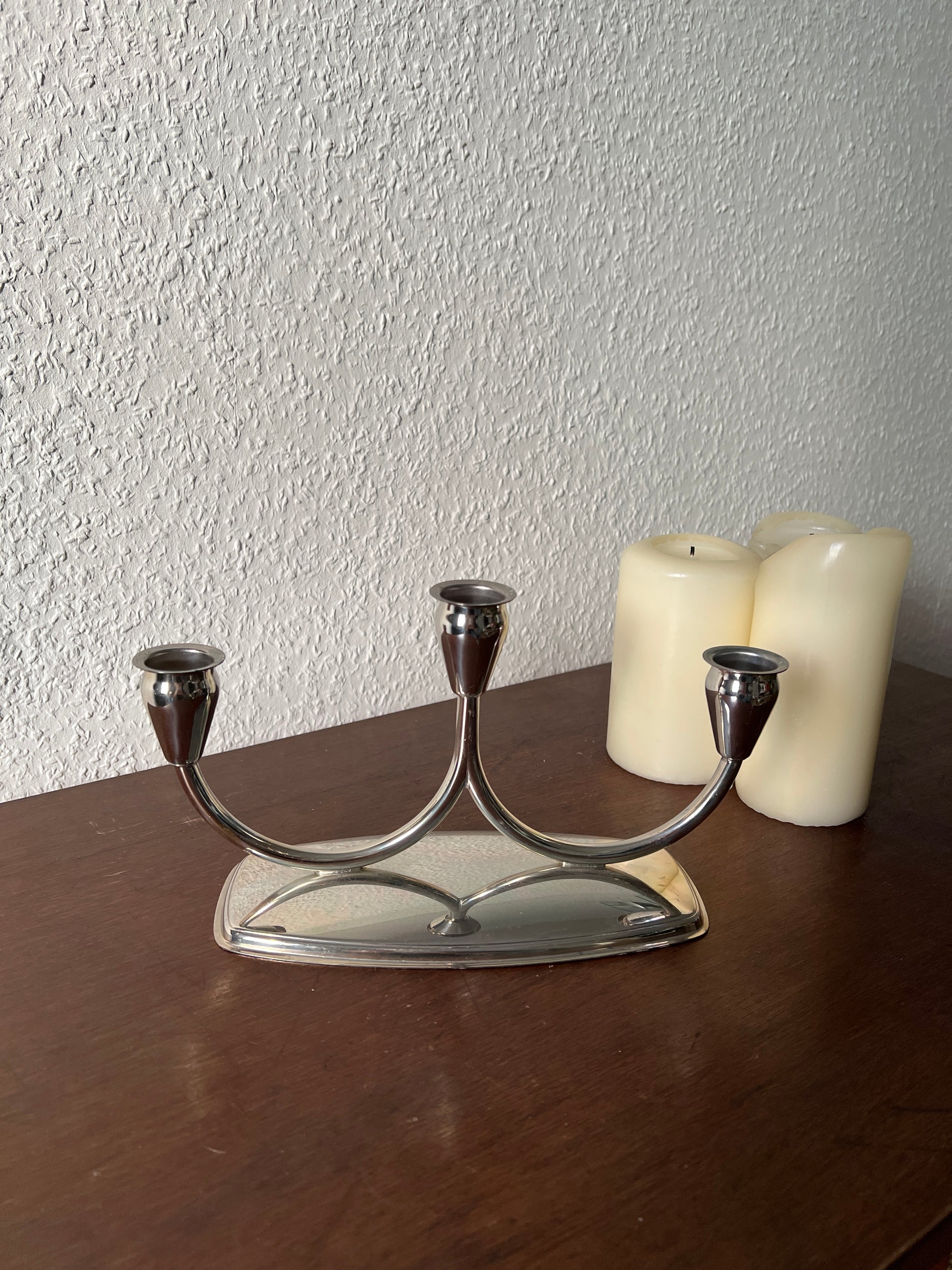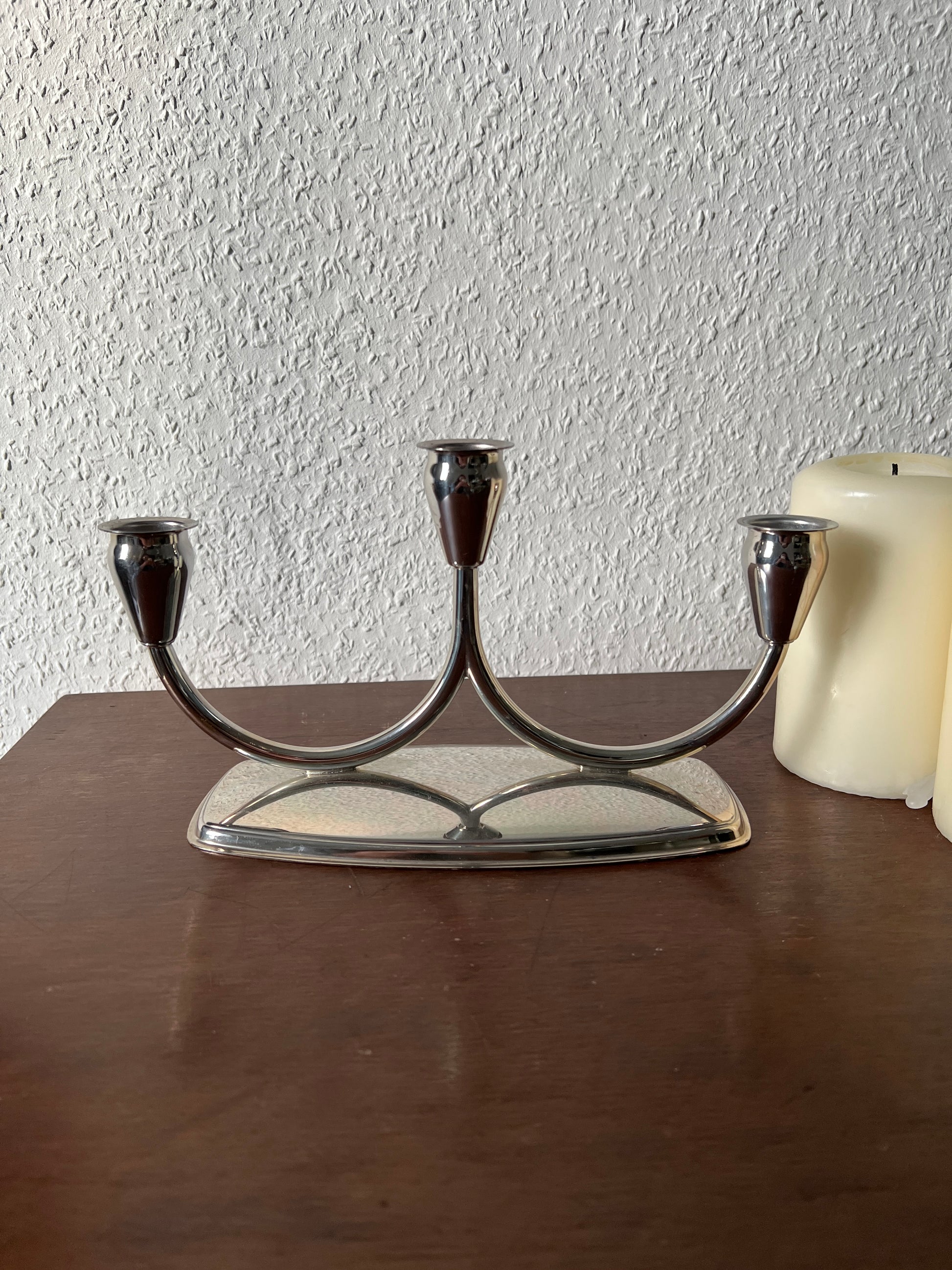 This charming, silver-plated, three-armed candleholder combines mid-century modern aesthetics with timeless elegance. This piece adds a special, sophisticated touch to any room.