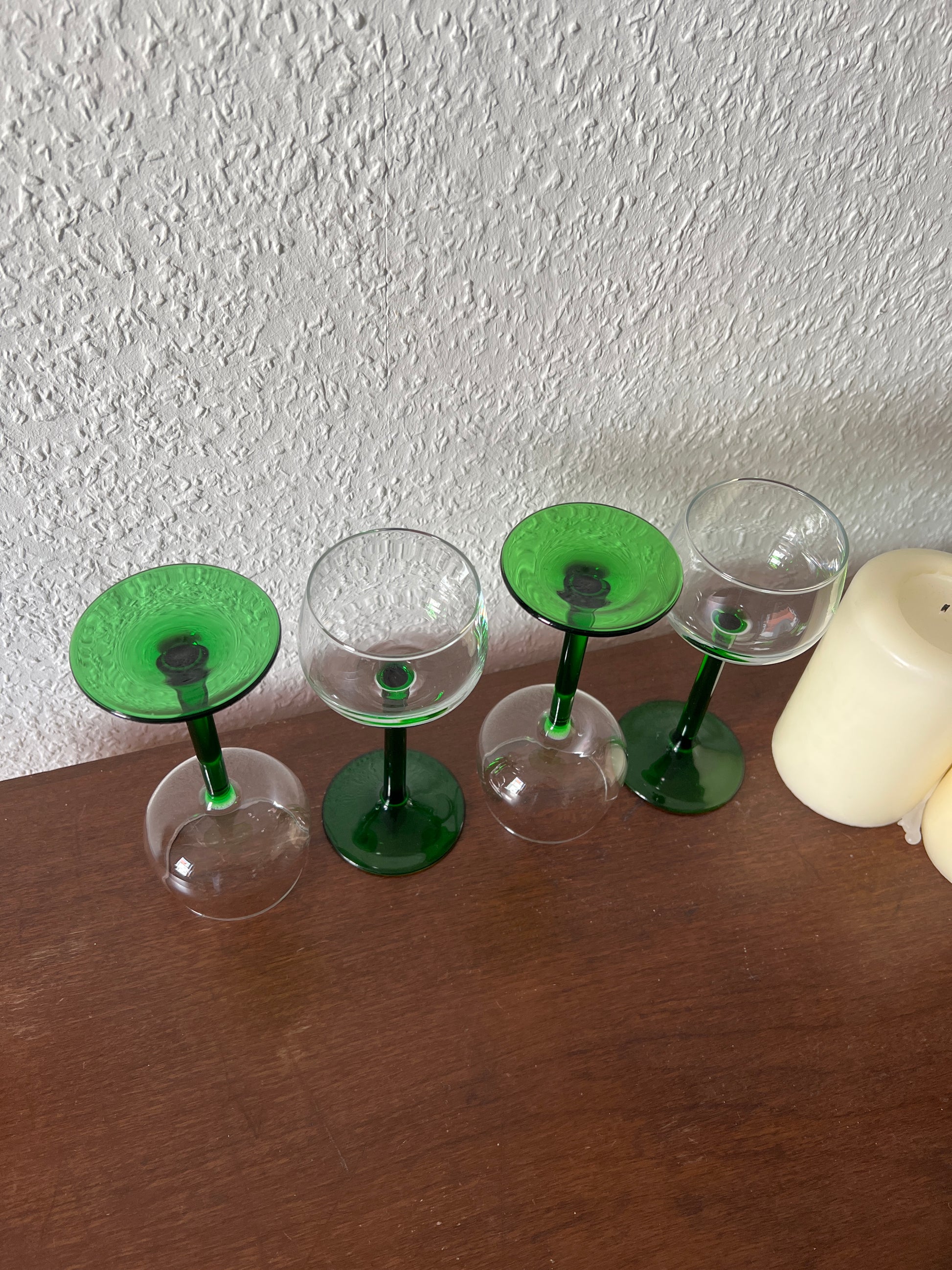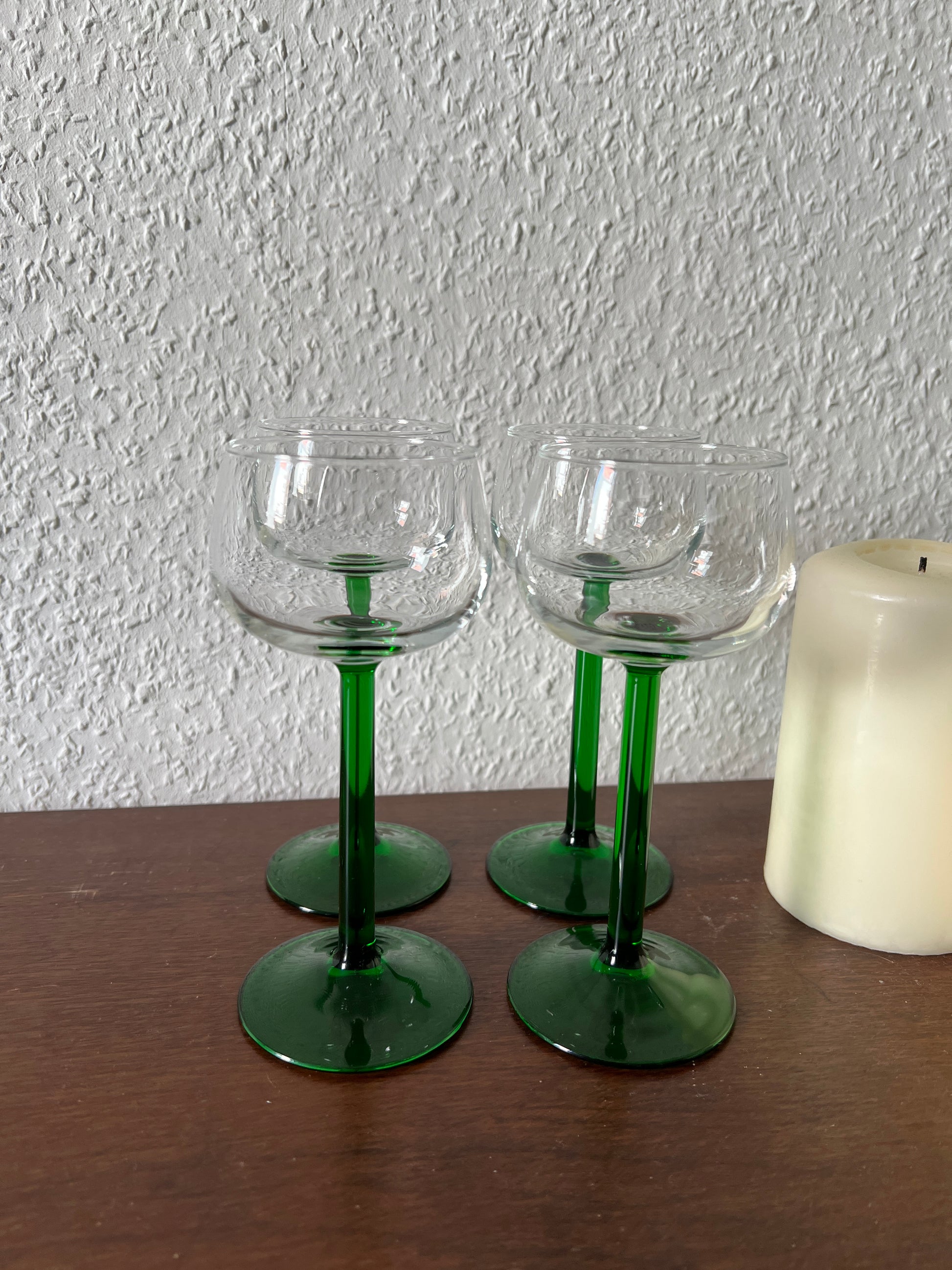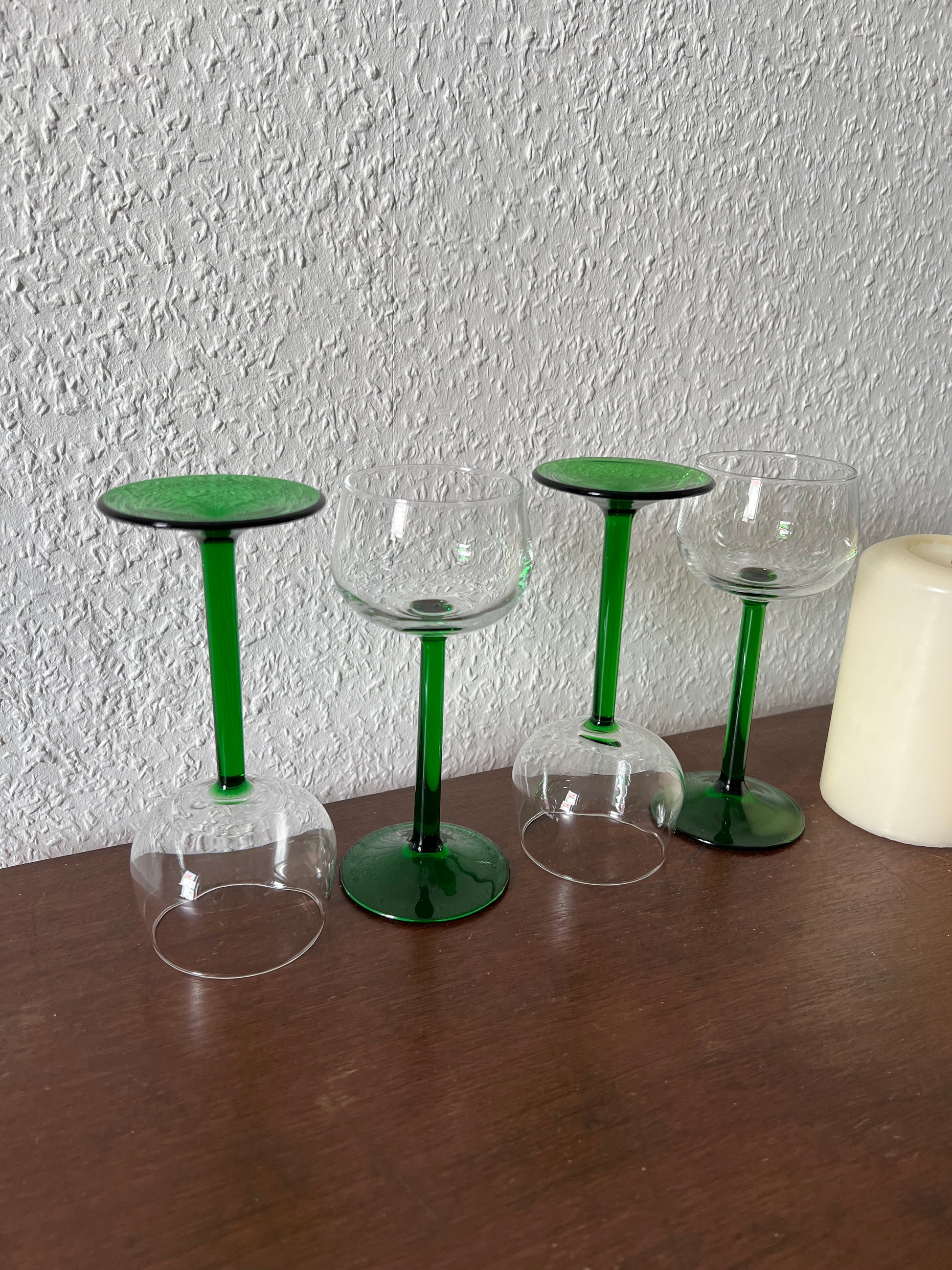 A beautiful set of four elegant liqueur or wine glasses with green stems from France – a real eye-catcher in vintage style! The combination of clear glass and emerald green stems gives these glasses a timeless elegance and a touch of retro charm.