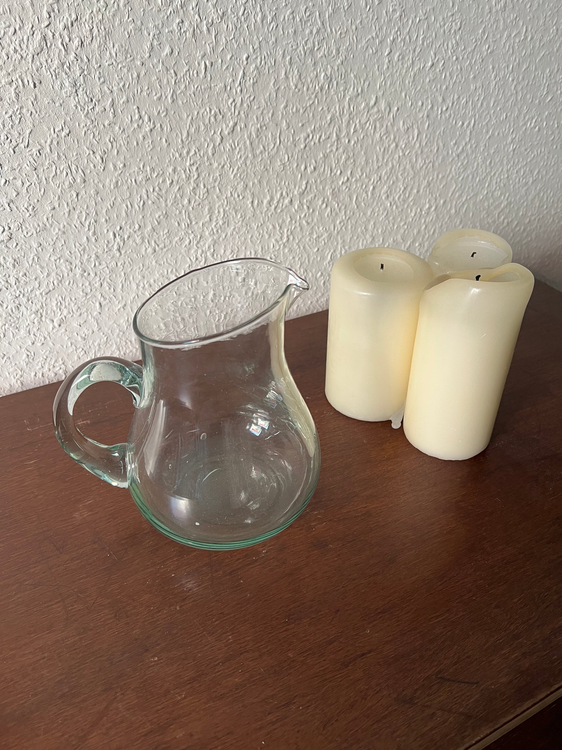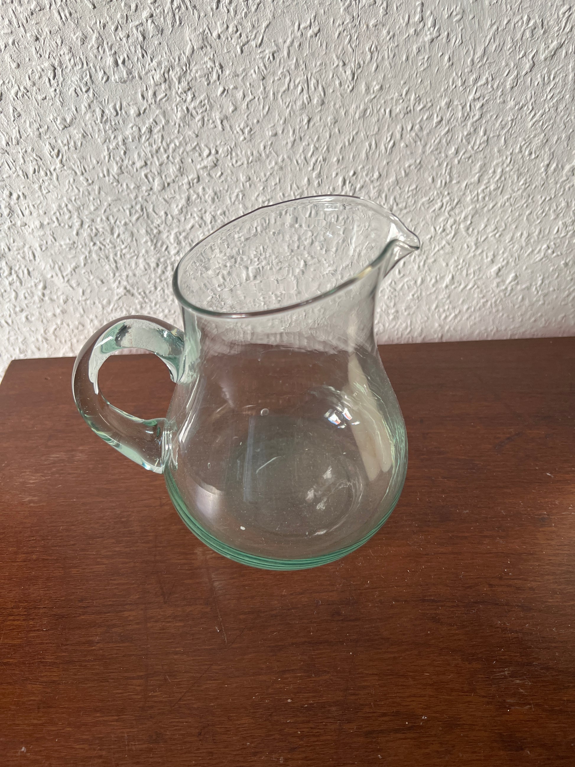 This charming glass pitcher combines rustic craftsmanship with functional design . Crafted from thick-walled , slightly greenish- shimmering glass, it features an organic , bulbous shape and an elegantly curved spout that facilitates pouring. The generous handle sits comfortably in the hand and underscores the carafe's sleek lines.