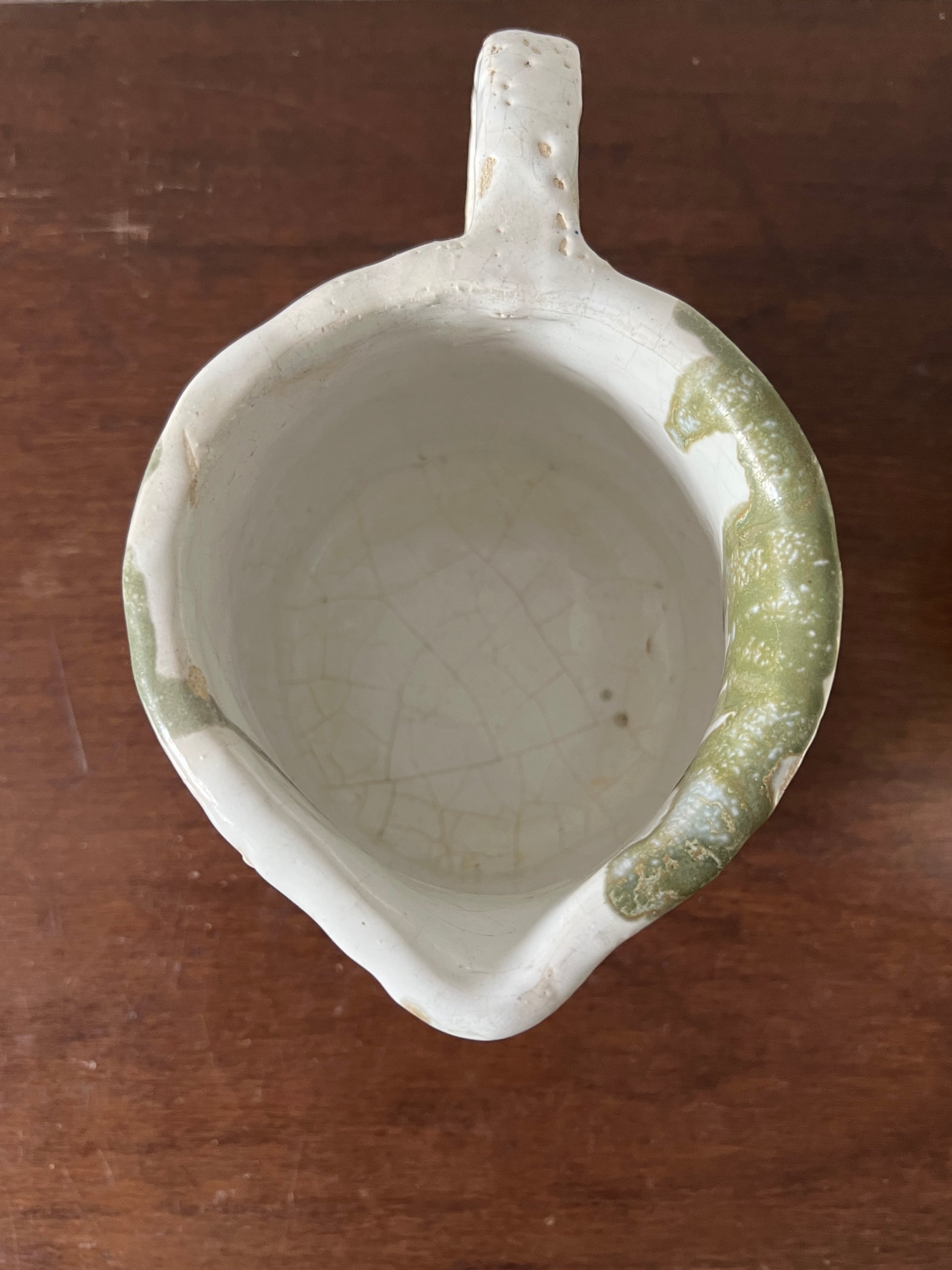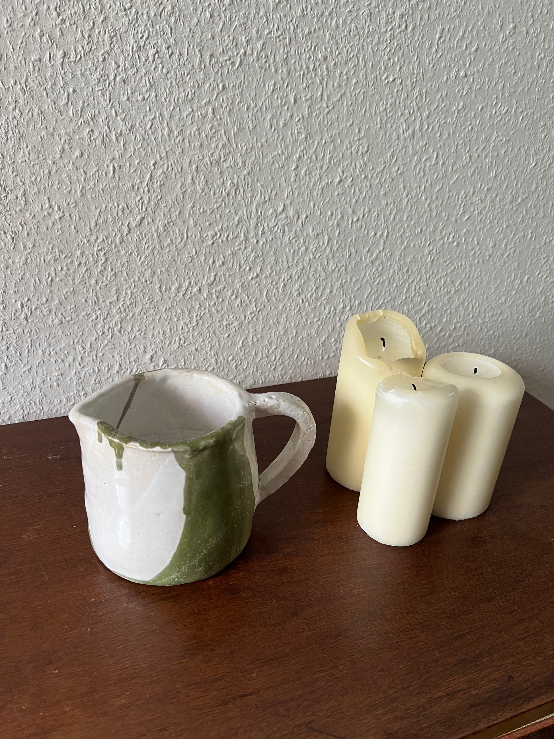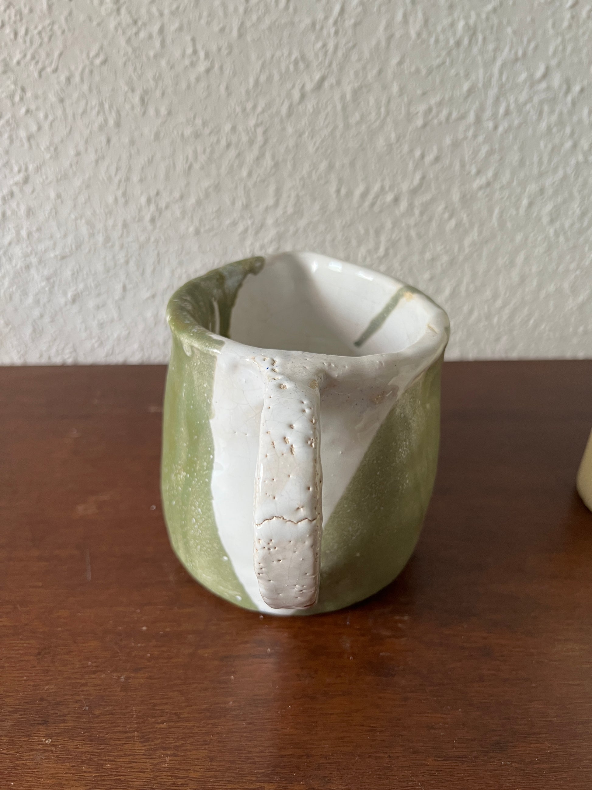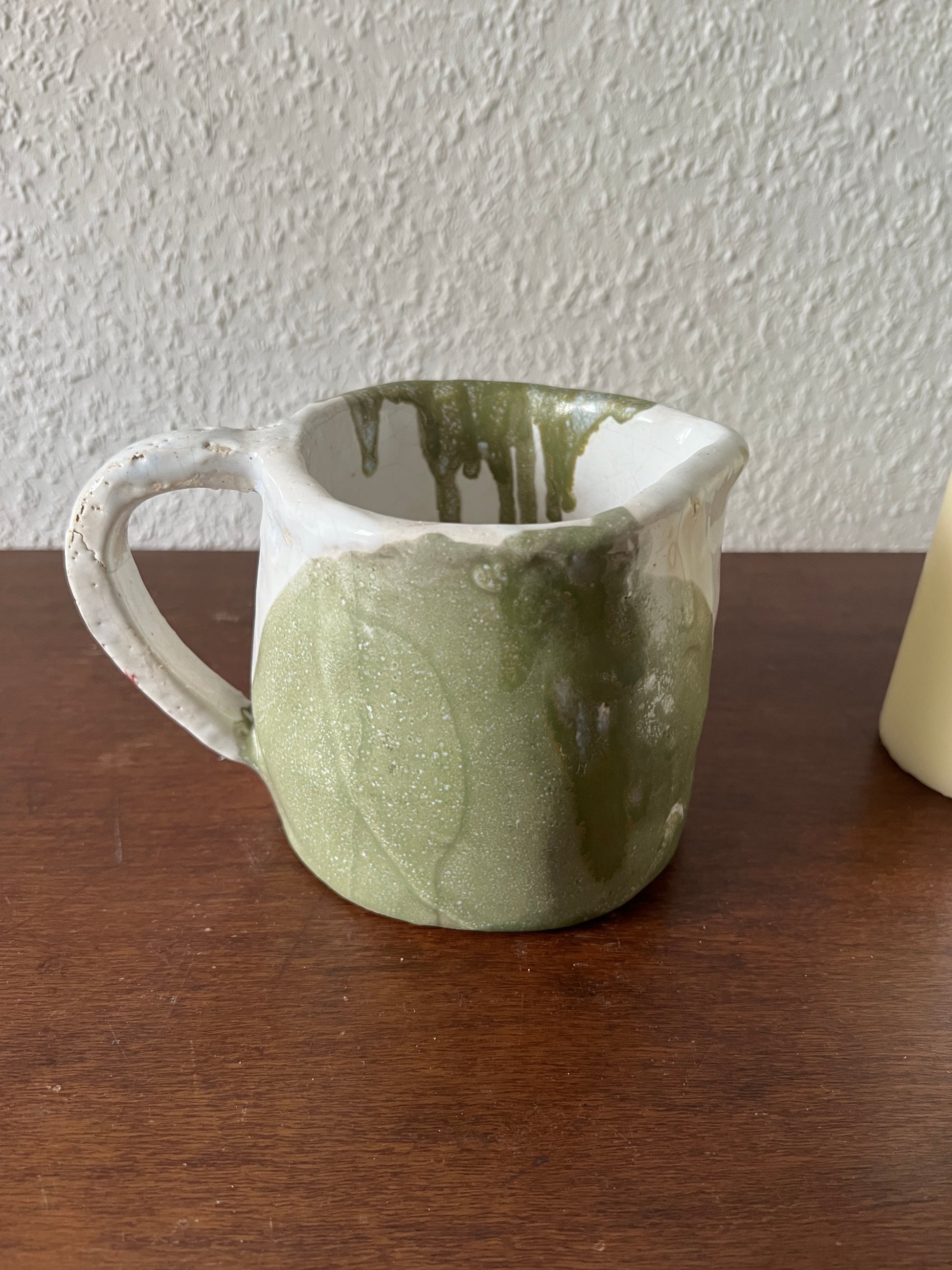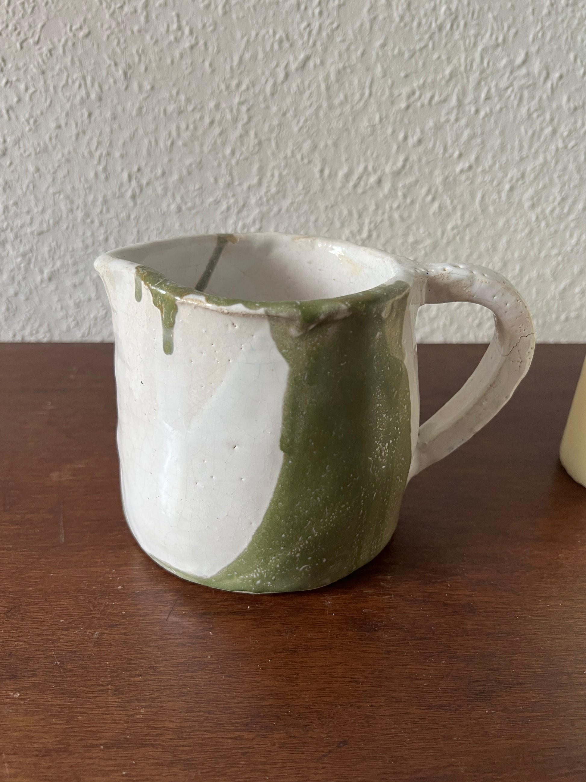 A unique , handmade ceramic pitcher with a charming white and green design. The natural glaze and irregular surface give it a rustic and authentic character . Perfect as a decorative piece or for everyday use .