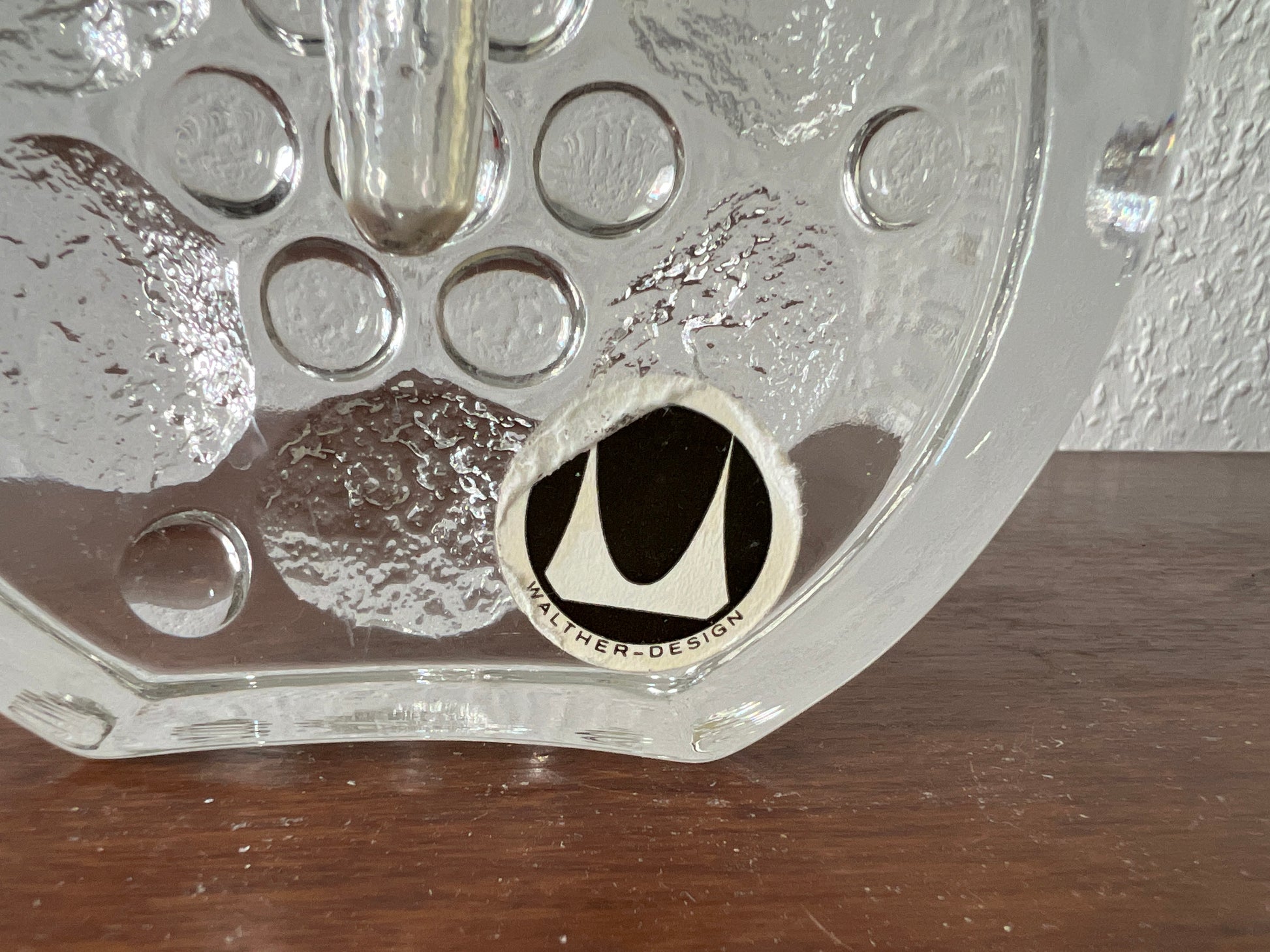This decorative glass vase by Walther-Design impresses with its unusual round shape and a striking, textured relief pattern on the back artfully captures light and shadow, featuring organic, partly clear, partly frosted glass elements. The design is typical of the Mid-Century Modern era: geometric, puristic, yet playful. The cylindrical centerpiece offers space for individual blossoms or delicate dried bouquets, while the flat, sculptural design makes it a stand-alone decorative object.