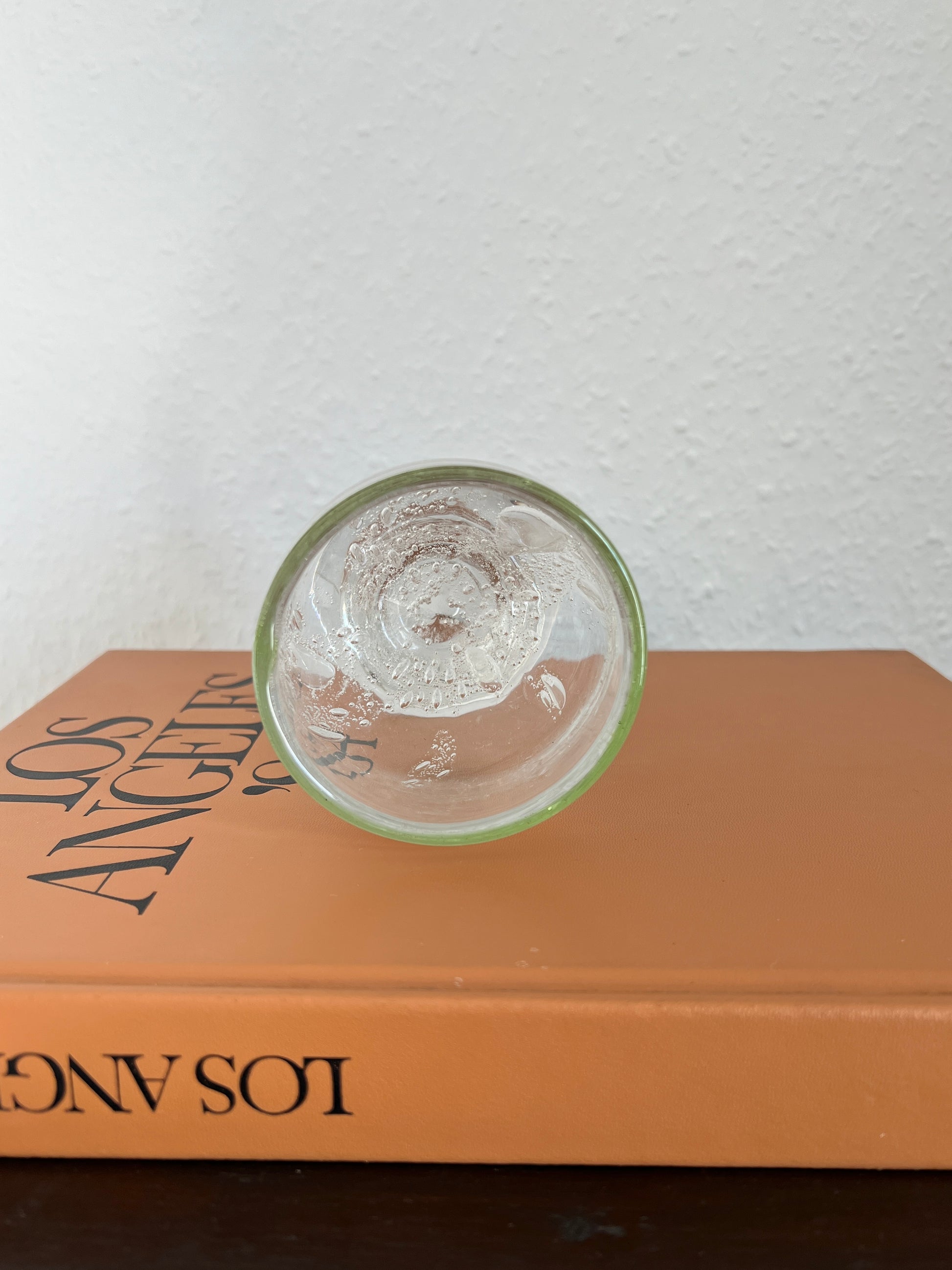 Handgefertigtes Glas aus der Serie Waldperle der Glashütte Eisch (Frauenau, Bayern). Charakteristisch sind die feinen Lufteinschlüsse im Glas und der leicht grün getönte Rand. Jedes Stück wurde mundgeblasen und ist ein Unikat mit organischer Struktur und charmanten Blaseneinschlüssen.